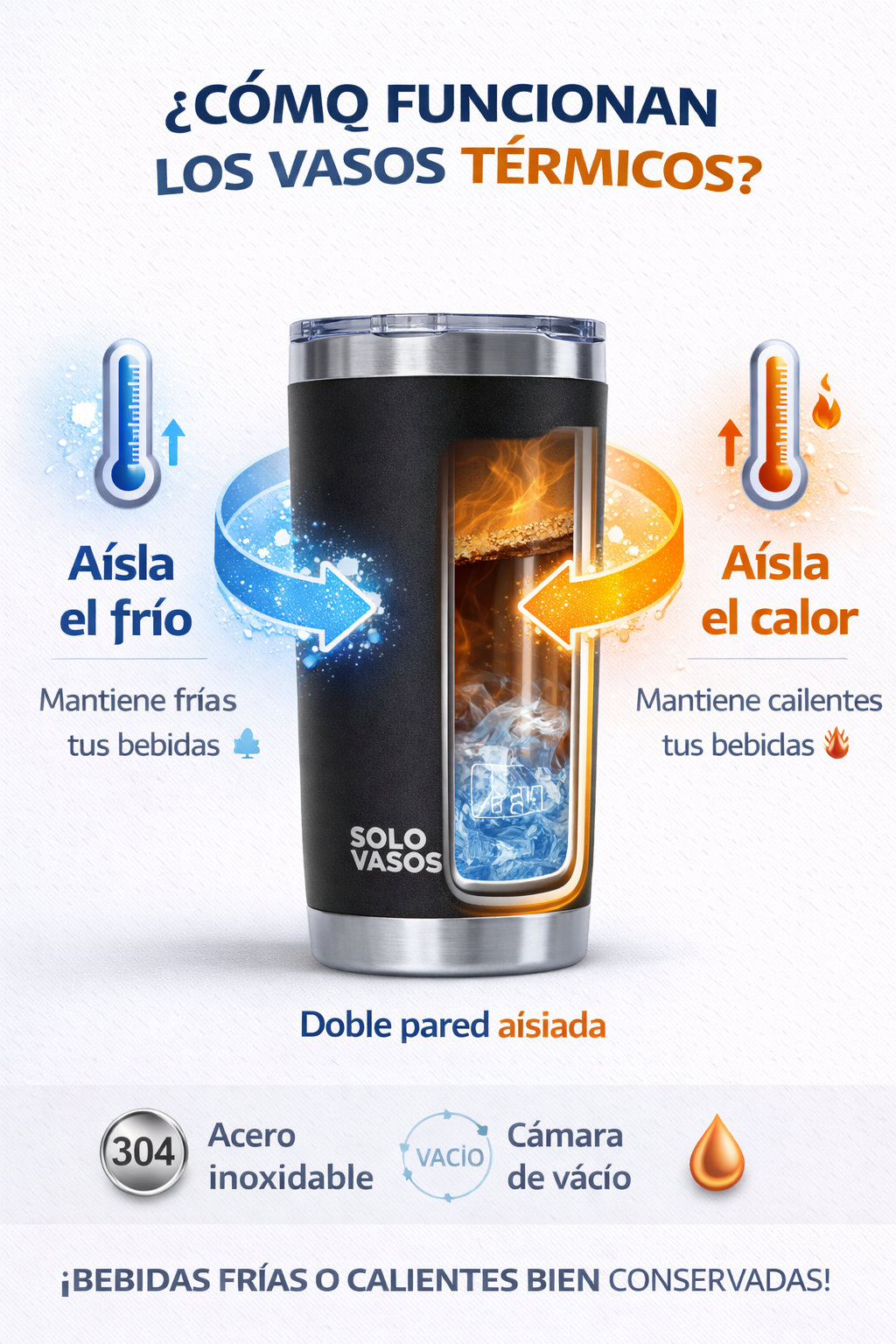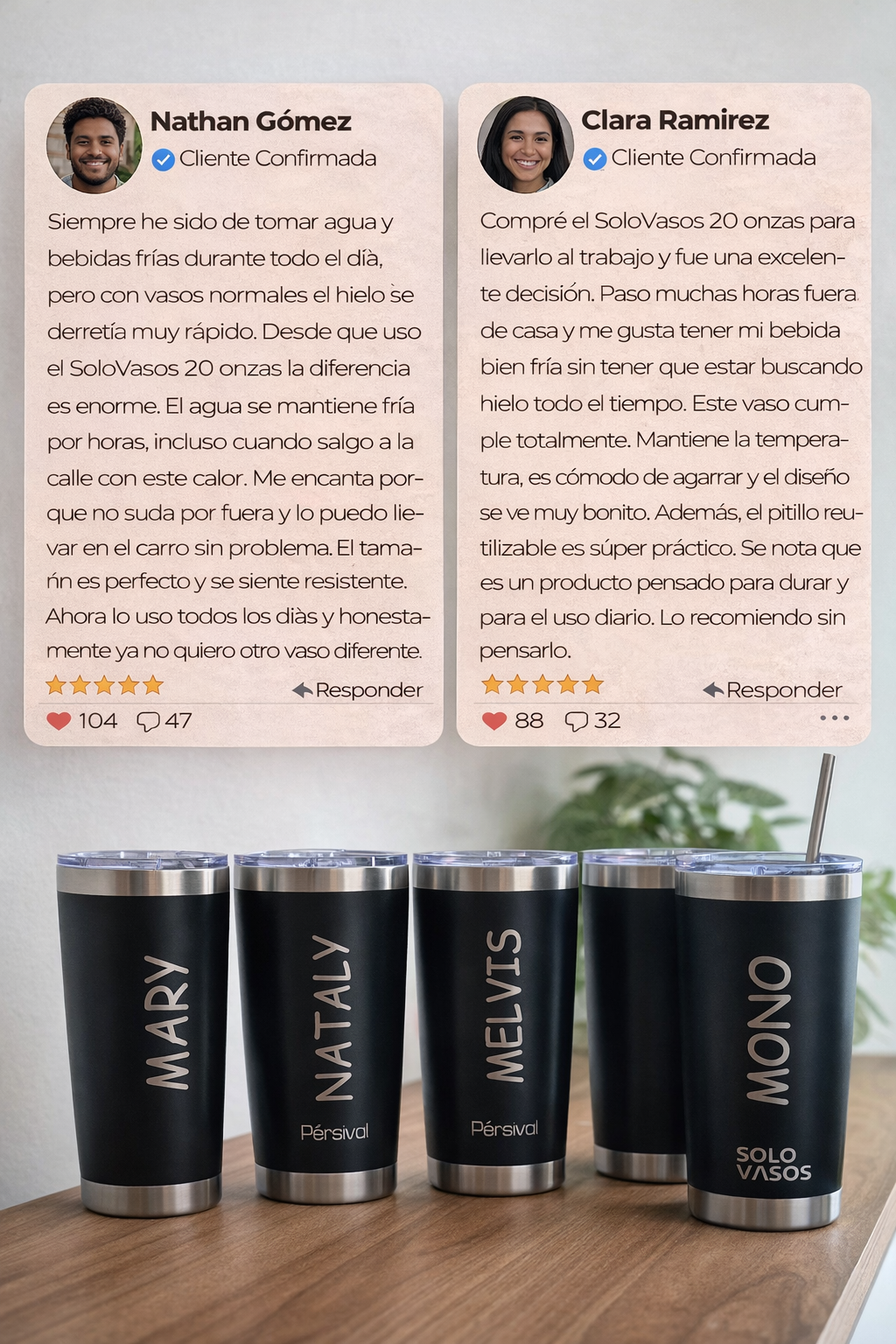 SoloVasos de 20 onzas, diseñados para mantener tus bebidas justo como te gustan. Conservan el frío hasta por 8 horas y el calor hasta por 4 horas, ideales para acompañarte durante toda la jornada sin perder temperatura.