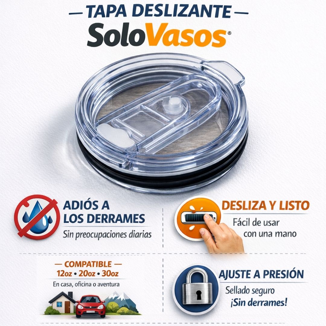 Descubre las Tapas Deslizantes para vasos de 12oz, 20oz y 30oz, compatibles con SoloVasos, BJPK y YETI (NO de rosca). Están diseñadas para ayudarte a evitar derrames y disfrutar tus bebidas con mayor comodidad en cualquier momento.